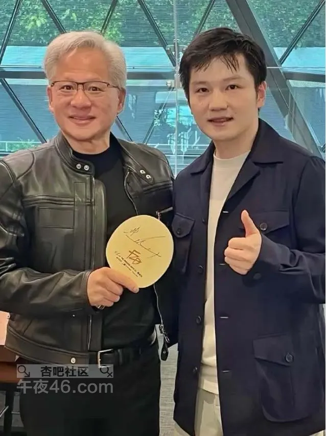 此前,樊振东在社媒晒出与英伟达创始人黄仁勋的合影,两人一起打乒乓球。